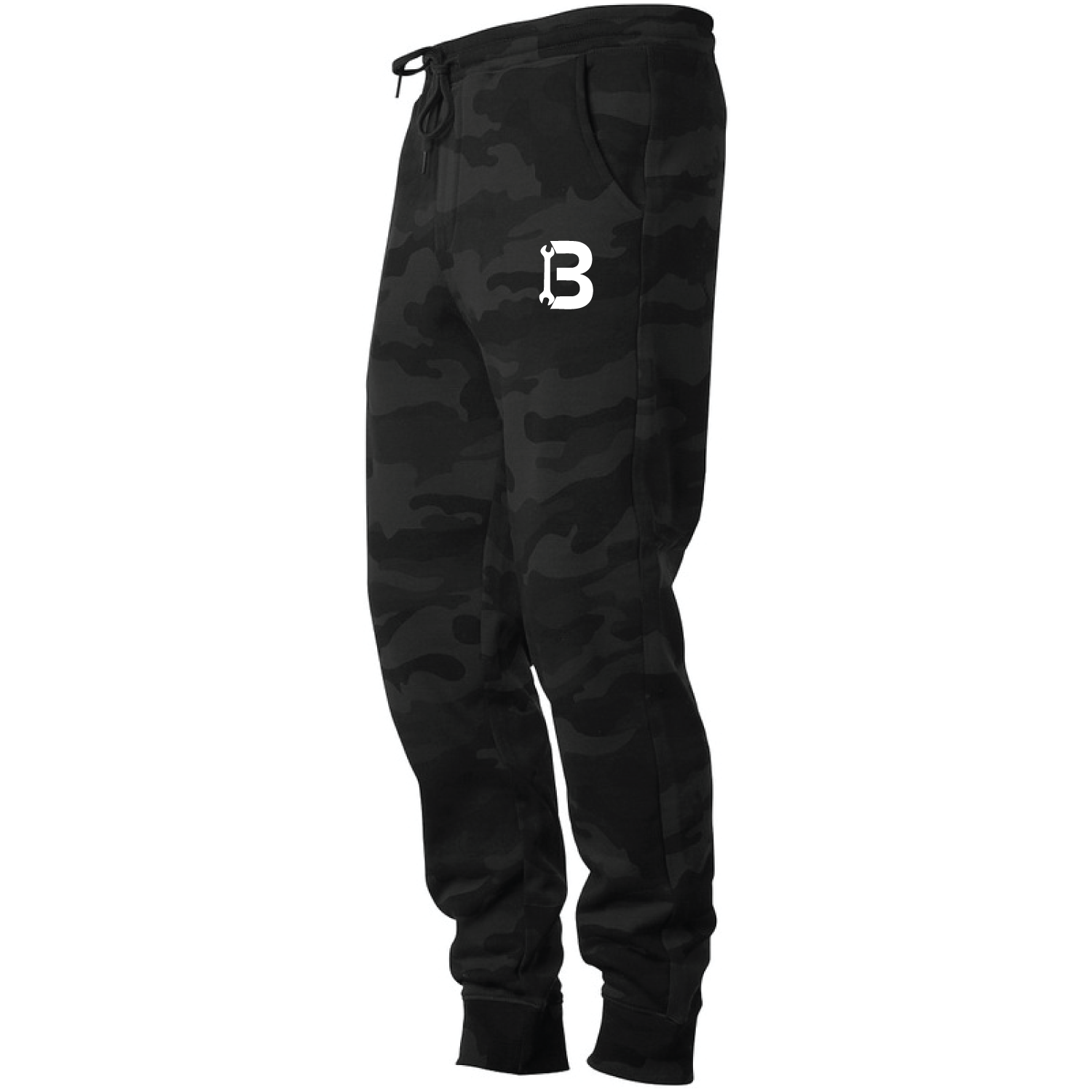 Embroidered logo featured on these dope jogger style sweatpants available in black, black camo, and woodland camo in men's sizes.